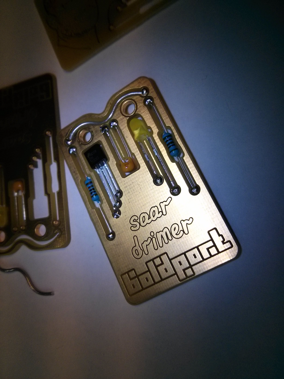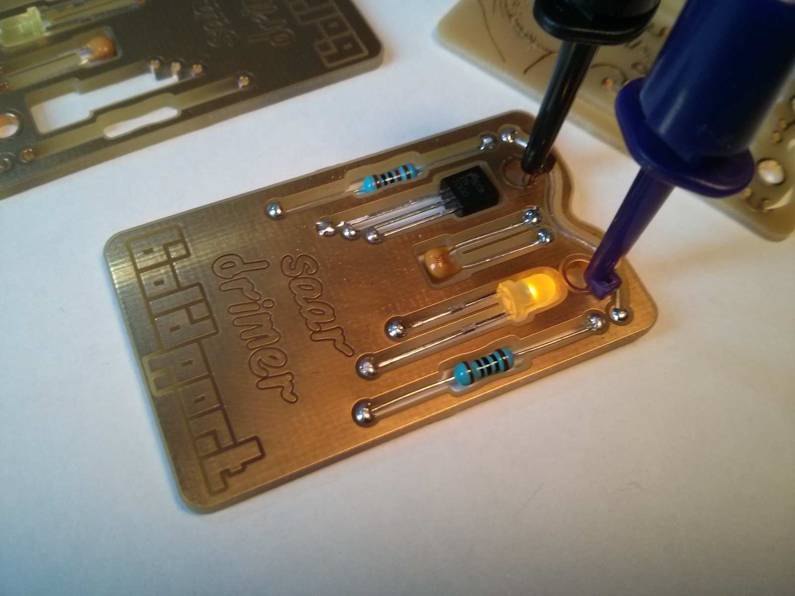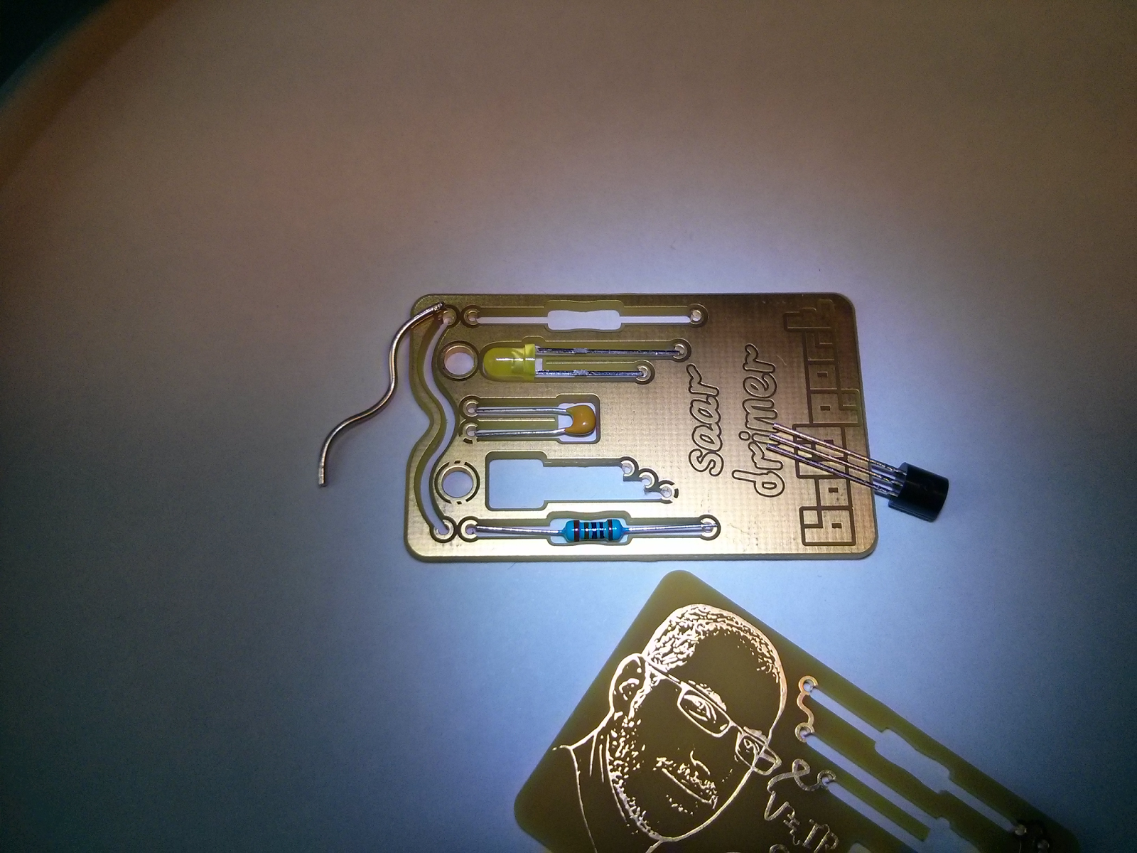 and soldered lying down. The components -- two resistors, LED, NPN
